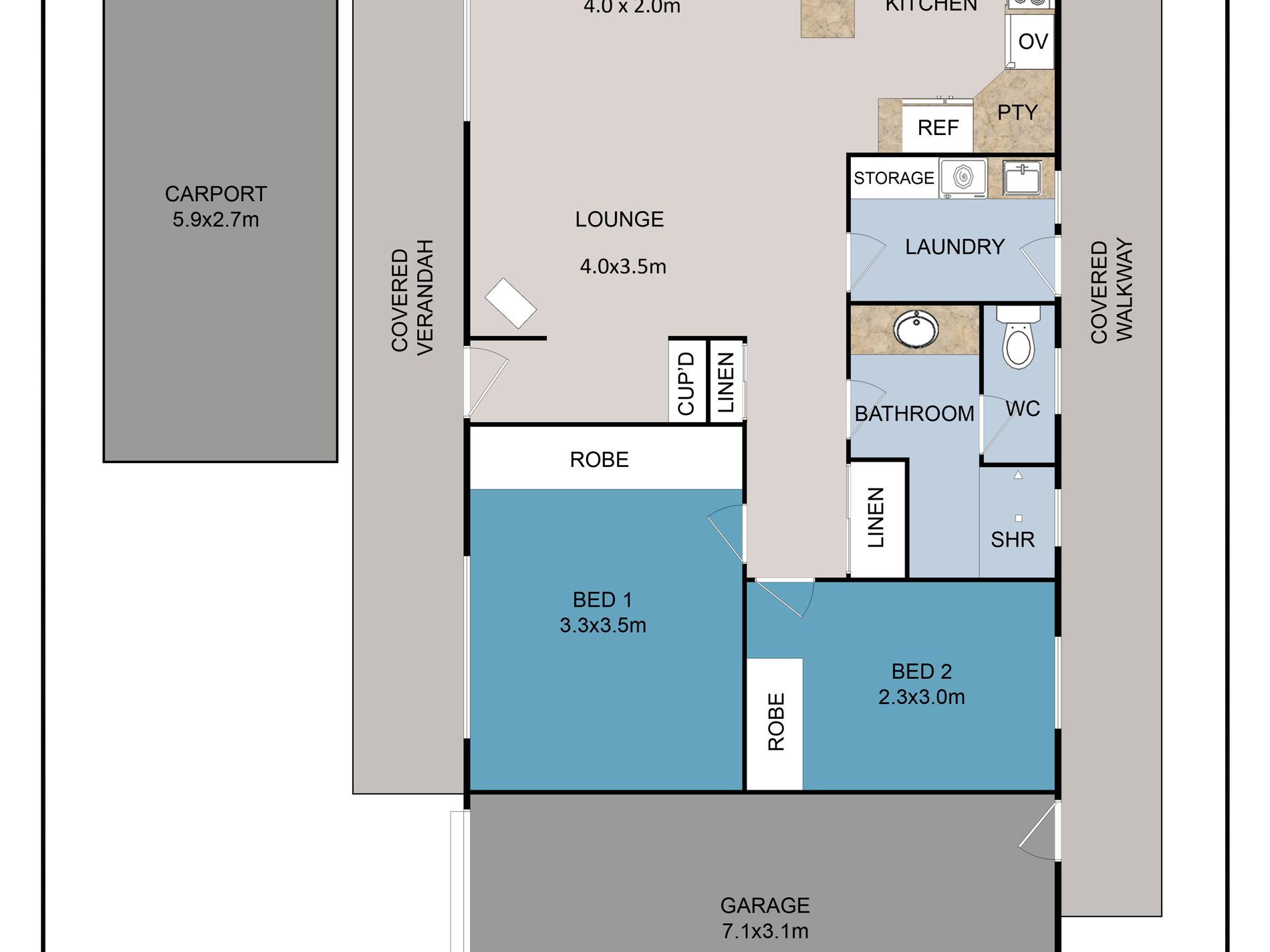 This brick home has 2 generous bedrooms, a comfortable living area with wood heating and ceiling fan, north aspect and a well appointed kitchen.
