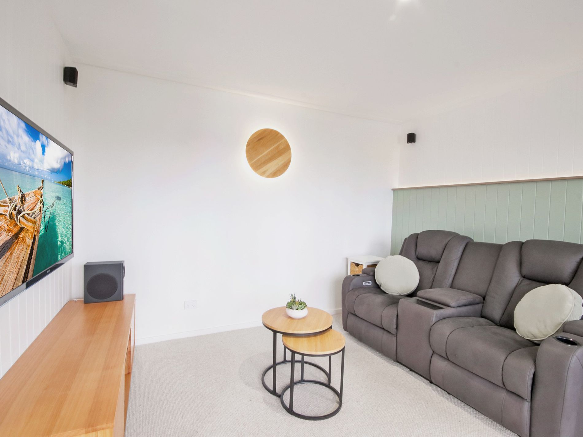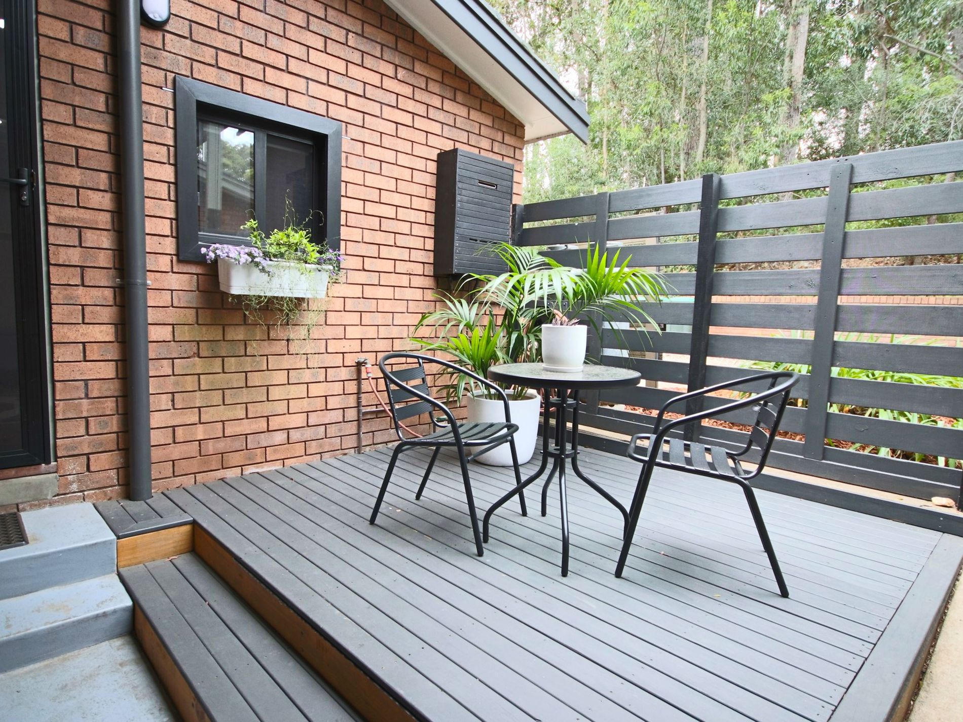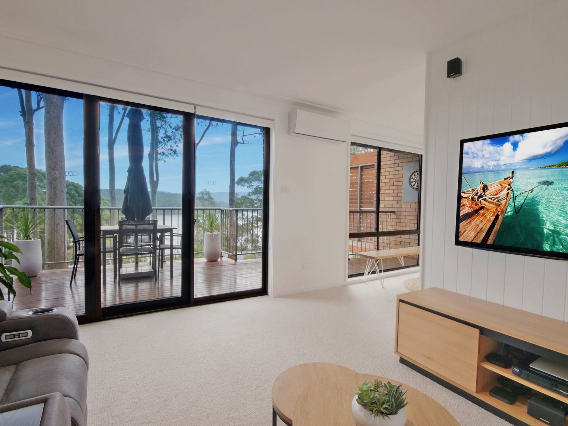 On entry, you are welcomed by a modern staircase leading you downstairs to the kitchen and living area, complete with a separate powder room. Step out from the living area onto the deck where you can enjoy the water views. It’s the perfect spot to relax, unwind, or entertain.