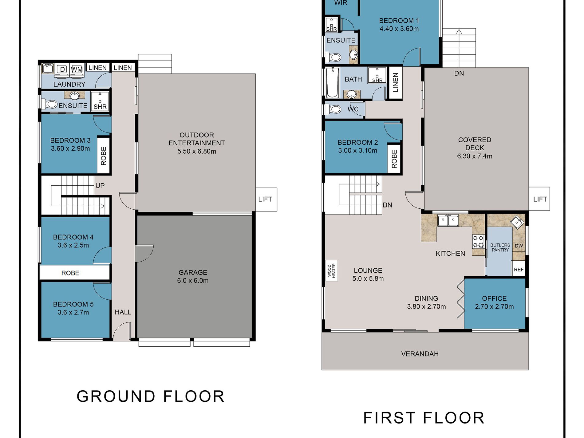 Upstairs, soak in ocean views from the expansive living room, kitchen and study. The modern kitchen boasts a full butler’s pantry, while the master retreat includes a stylish ensuite and walk-in robe. The spacious 5th bedroom is on this level as well.